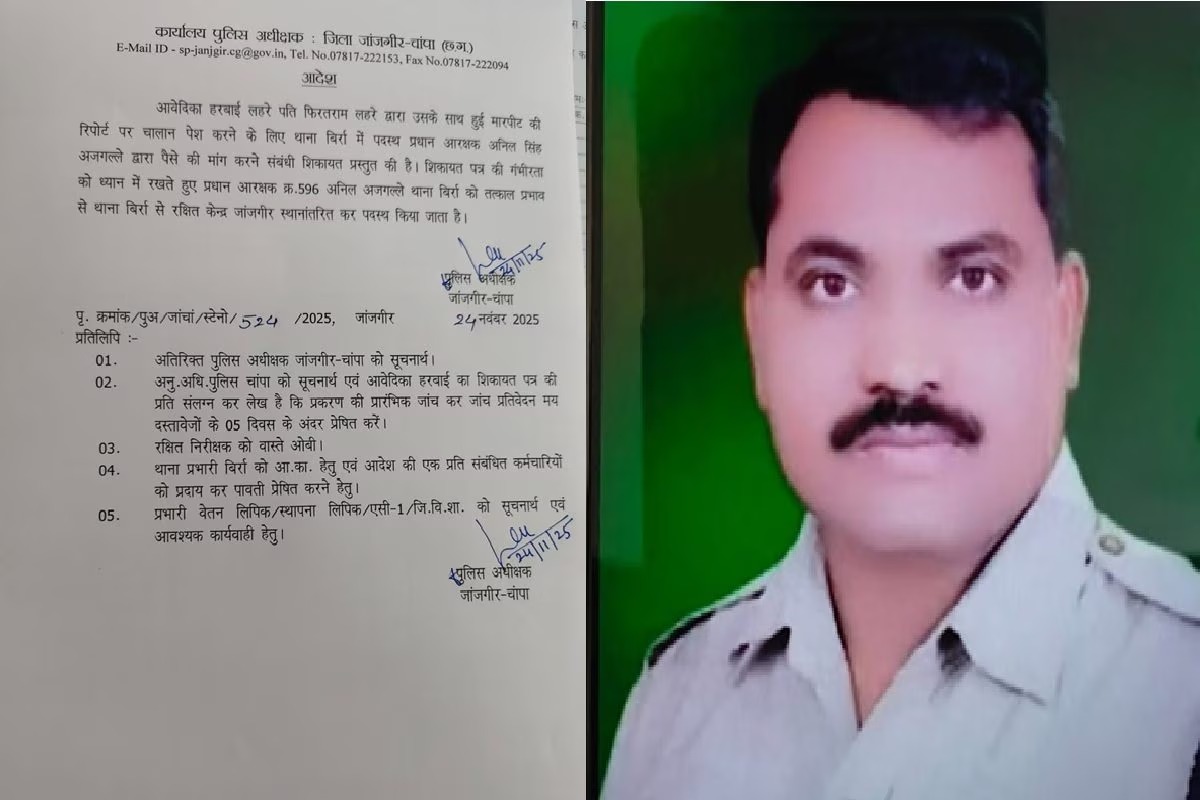 જાંજગીર-ચાંપા. જિલ્લાના બિરા પોલીસ સ્ટેશનમાં તૈનાત હેડ કોન્સ્ટેબલ અનિલ સિંહ અજગલેને લાંચ માંગવાના અને પીડિતાને ધમકાવવાના આરોપમાં લાઇનમાં જોડવામાં આવ્યા છે. એસપી વિજય કુમાર પાંડેએ ઓડિયો પુરાવા અને લેખિત ફરિયાદના આધારે આ કાર્યવાહી કરી હતી.
