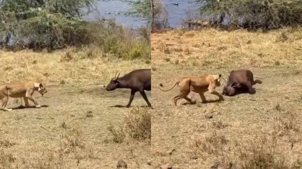 જંગલની દુનિયા એક વિચિત્ર જગ્યા છે. ક્યારે શું થશે તેની કોઈને ખબર નથી. એક ક્ષણે પ્રાણી જીવંત અને સારી રીતે દેખાય છે, અને બીજી જ ક્ષણે તે શિકાર દેખાય છે. આવી ઘટનાઓ જંગલમાં વારંવાર બનતી રહે છે. આવો જ એક વીડિયો આ દિવસોમાં સોશિયલ મીડિયા પર વાયરલ થઈ રહ્યો છે, જે લોકોને આશ્ચર્ય અને પ્રેરણા આપે છે. આ વીડિયોમાં શરૂઆતમાં એક ભેંસ સિંહણને ડરાવતી અને તેને પીછેહઠ કરવા મજબૂર કરતી જોવા મળે છે, પરંતુ બીજી જ ક્ષણમાં એવો નાટકીય વળાંક આવે છે કે જોનારાઓ ચોંકી જાય છે.