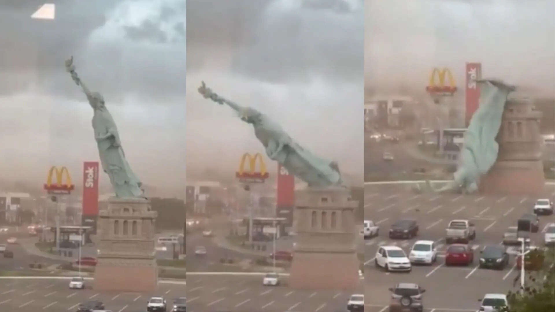 વિડિયો ફૂટેજમાં સ્ટેચ્યુ ઑફ લિબર્ટીની ચાલીસ-મીટર-ઉંચી પ્રતિકૃતિ બતાવવામાં આવી છે, જે બ્રાઝિલના શહેર ગુઆબામાં એક હવનના પાર્કિંગની અંદર મેકડોનાલ્ડ્સની આજુબાજુ સ્થિત છે, જે સમગ્ર દેશમાં સ્થિત પ્રતિમાની અનેક ડઝન પ્રતિકૃતિઓમાંની એક છે, જે પવન દરમિયાન તૂટી પડી હતી અને… pic.twitter.com/kUid9lwA3b