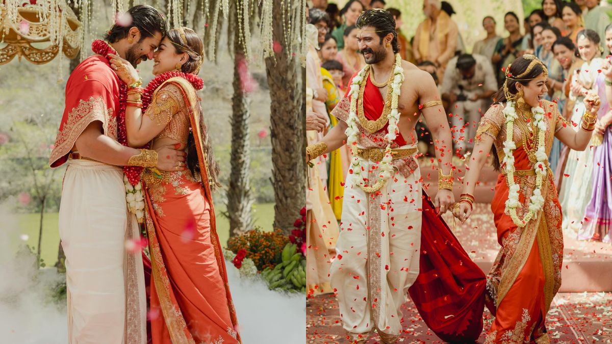 વિજય દેવેરાકોંડાએ આ લગ્નમાં હાથીદાંતની ધોતી સાથે આબેહૂબ સિંદૂર અંગાવસ્ત્રમ પહેર્યું હતું, જે તેના લુકને પારંપરિક ટચ આપી રહ્યું હતું. અંગવસ્ત્રમ પર મંદિર અને વન પ્રેરિત ભરતકામથી પોશાક અદભૂત દેખાય છે. પરંપરાગત સોનાના આભૂષણો, પવિત્ર થ્રેડ અને તાજગી આપતી જાસ્મિન માળા સાથે દેખાવ પૂર્ણ કરવામાં આવ્યો હતો, જેનાથી તેણીનો દેખાવ વધુ ભવ્ય બન્યો હતો.