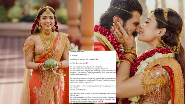 લગ્નની તસવીરો શેર કરતી વખતે રશ્મિકા મંદન્નાએ લખ્યું કે, “હાય મારા પ્રિયજનો, હવે હું તમારો પરિચય કરાવું.” “મારા પતિ” 💘 થી શ્રી વિજય દેવરાકોંડા!! ❤️ જે વ્યક્તિએ મને સાચા પ્રેમનો અર્થ શીખવ્યો,