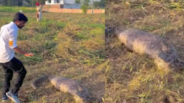 જેમ તમે કદાચ પહેલાથી જ જાણો છો, અજગર એ વિશ્વના સૌથી મોટા અને સૌથી ખતરનાક સાપ છે. જો કે તેઓ ઝેરી નથી, તેમ છતાં તેઓ તેમના ઝેર વિના ઝેરી સાપ કરતાં વધુ ખતરનાક માનવામાં આવે છે. જો તેઓ તેમના શિકારને પકડે તો પણ તેમના માટે બચવું મુશ્કેલ છે. એક મોટા અજગરનો આવો જ એક ચોંકાવનારો વીડિયો આ દિવસોમાં સોશિયલ મીડિયા પર વાયરલ થઈ રહ્યો છે. વીડિયોમાં આ વિશાળ અજગર ખેતરની વચ્ચે જોવા મળી રહ્યો છે, જે આસપાસના લોકોને ડરાવી રહ્યો છે. જો કે, એક વ્યક્તિએ એવી હિંમત બતાવી કે બધા આશ્ચર્યચકિત થઈ ગયા.